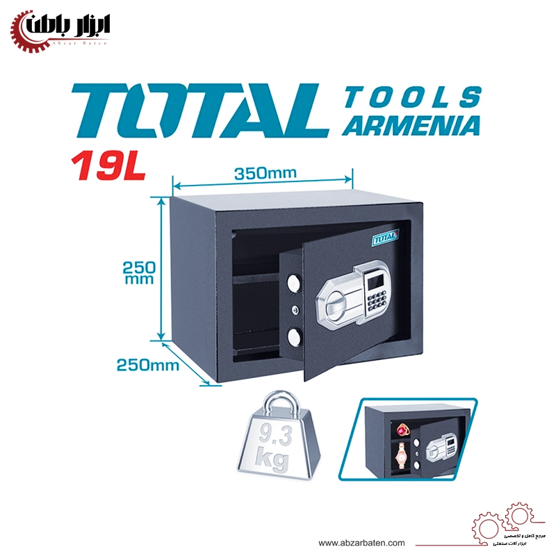 گاوصندوق 19 لیتری الکترونیک توتال مدل TESF2501 یک گاوصندوق الکترونیکی با کیفیت است که توسط برند جهانی توتال تولید شده است . برند توتال یک کمپانی جهانی میباشد که با استفاده از تکنولوژی های روز دنیا و رعایت استانداردهای صنعتی روز دنیا محصولات خود را تحت لیسانس آمریکا در کشور چین تولید کرده و به تمامی کشور های جهان از جمله کشور های اروپایی صادر میکند که به این واسطه دارای استاندارد CE اروپا نیز میباشد ، از مشخصات این محصول میتوان به کیفیت بالای طراحی ، ضخامت درب 4.2 میلیمتری ، امکان ثبت کد ۳ تا ۸ رقمی ، داشتن 2 عدد کلید برای مواقع ضروری و امکان نصب آن بر روی زمین و دیوار اشاره کنیم . به طور کلی اگر دنبال یک گاوصندوق الکترونیکی باکس شیک و با کیفیت هستید که روزانه بدون مشکل با آن کار کنید گاوصندوق 19 لیتری الکترونیک توتال مدل TESF2501 یک گزینه ایدهآل برای شماست .