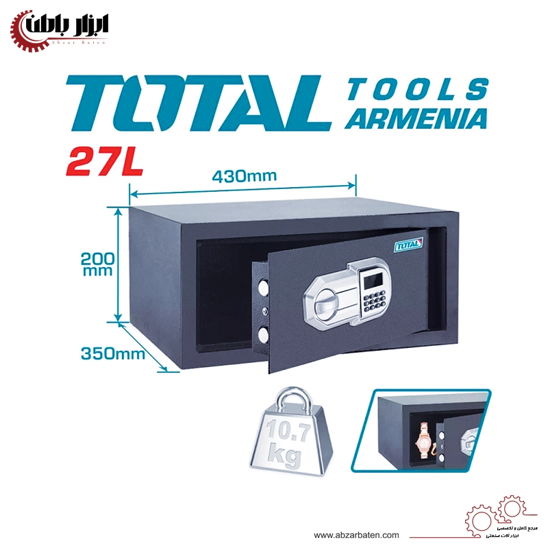 گاوصندوق 27 لیتری الکترونیک توتال مدل TESF3501 یک گاوصندوق الکترونیکی با کیفیت است که توسط برند جهانی توتال تولید شده است . برند توتال یک کمپانی جهانی میباشد که با استفاده از تکنولوژی های روز دنیا و رعایت استانداردهای صنعتی روز دنیا محصولات خود را تحت لیسانس آمریکا در کشور چین تولید کرده و به تمامی کشور های جهان از جمله کشور های اروپایی صادر میکند که به این واسطه دارای استاندارد CE اروپا نیز میباشد ، از مشخصات این محصول میتوان به کیفیت بالای طراحی ، ضخامت درب 4.2 میلیمتری ، امکان ثبت کد ۳ تا ۸ رقمی ، داشتن 2 عدد کلید برای مواقع ضروری و امکان نصب آن بر روی زمین و دیوار اشاره کنیم . به طور کلی اگر دنبال یک گاوصندوق الکترونیکی باکس شیک و با کیفیت هستید که روزانه بدون مشکل با آن کار کنید گاوصندوق 27 لیتری الکترونیک توتال مدل TESF3501 یک گزینه ایدهآل برای شماست .